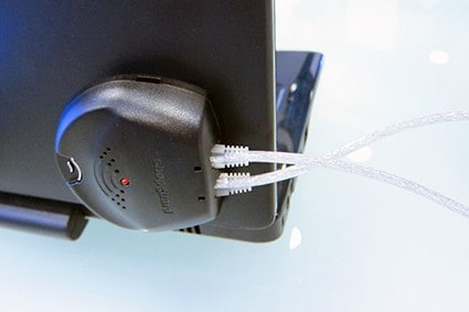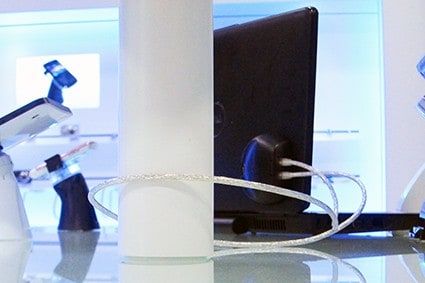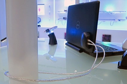 All you need to do is to stick the PCG onto the back of the laptop screen and create a cable loop through the furniture or any other stable parts. Both ends of the cable are plugged into the PCG, creating a loop alarm. The RF/AM tag combination triggers the EAS antenna if the stolen laptop is leaving the store.